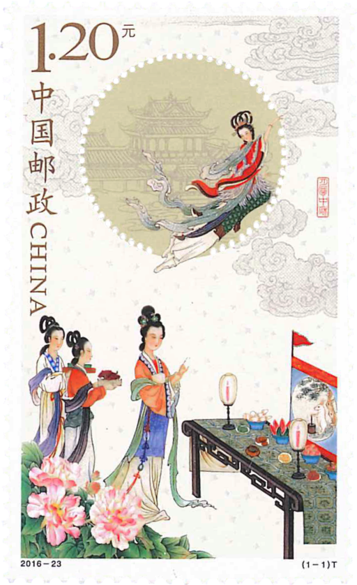 中秋节,又称仲秋节,时在每年的农历八月十五日,因在三秋之半而得名。中秋节始于唐朝初年,盛行于宋朝,至明清时,已与春节齐名而成为中国的主要节日之一。赏月,吃月饼,观潮、团聚宴饮,人们在中秋月圆之时,会用不同的方式,将自己内心最美好的愿望寄予月神,期望能够实现。中秋被中国人喻为最有人情味,最具诗情画意的传统节日之一,中国人对月亮寄托着情怀,更多地对她赋予了情感色彩。中秋月亮的圆满引申到人事的团圆、家庭的团圆、亲友的团圆、民族的团圆、社会的和谐。邮票采用中国画工笔手法,上半部分是与月亮有关的神话传说《嫦娥奔月》;下半部采用民间中秋拜月的场景,祈求生产丰收、身体安康、多福多寿、家庭团圆。