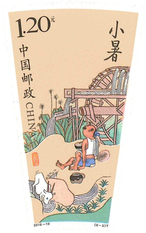 中国是一个历史悠久的文明古国,人民从亲身实践中认识总结了丰富的生产和生活经验,二十四节气堪称人民智慧的结晶。二十四节气起源于我国黄河流域,到秦汉时期,二十四节气已经完全确立。节气习俗和节日活动共同组成了中华民族的岁时节令文化,在几千年的历史长河中不断完善和发展,历代传承。农历二十四节气既包括相关的谚语、歌谣、传说等,又有传统生产工具、生活器具、工艺品、书画等艺术作品,还包括与节令关系密切的节日文化、生产仪式和民间风俗。二十四节气是中国古代农业文明的具体表现,具有很高的农业历史文化的研究价值,反映了社会各阶层的生活风貌、礼仪交往、文化思想、民俗娱乐等。节气既是人们对天文、气象、物候的科学认识总结,也是古代历法的创造之一。节气将一年内太阳运行的位置变化及由此引起的地面气候演变秩序,划分为24个阶段,每段约隔半个月时间,然后分配在12个月里,以反映四季、气温、物候等情况。本套邮票发行立夏、小满、芒种、夏至、小暑、大暑六个节气。