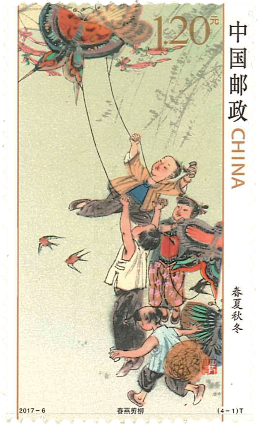 地球在围绕太阳不停地公转的同时,也在绕自身的地轴自转,不过地轴并不垂直于公转轨道面,而是有一个66.5度的倾角。正因为这个倾角的存在,才会使太阳在地球表面的直射点在南、北回归线之间移动,从而形成了春夏秋冬,又称为“四季”。春天始于二十四节气中的“立春”,夏天始于“立夏”,秋天始于“立秋”,冬天则始于“立冬”。四季的概念在黄河流域最为确切,我国劳动人民总结的基本规律是春生、夏长、秋收、冬藏。正是《黄帝内经》等国学典籍所阐述的人与自然关系的基本思想。春夏秋冬四季在中国人眼里不仅是季节的分界,更是人与自然的和谐相处。邮票内容分别为:春燕剪柳、夏荷戏水、秋鸡鸣穗、冬雪映梅。“春”来微风和煦、两岸柳扬,一群幼童在放风筝;“夏”时孩子们摇着小船穿梭在荷花荡,有的顶着荷叶帽,有的摆弄着手中莲花;“秋”日云高万里,遍布金黄色调。孩童们忙着收稻谷;“冬”有飘漫天、梅红绽放,女儿家在忙着贴福字、孩童们蹲在地上放鞭炮,给新年讨个好彩头,一派喜气祥和的景象。