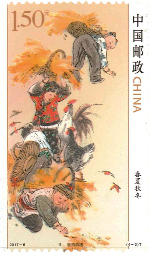 地球在围绕太阳不停地公转的同时,也在绕自身的地轴自转,不过地轴并不垂直于公转轨道面,而是有一个66.5度的倾角。正因为这个倾角的存在,才会使太阳在地球表面的直射点在南、北回归线之间移动,从而形成了春夏秋冬,又称为“四季”。春天始于二十四节气中的“立春”,夏天始于“立夏”,秋天始于“立秋”,冬天则始于“立冬”。四季的概念在黄河流域最为确切,我国劳动人民总结的基本规律是春生、夏长、秋收、冬藏。正是《黄帝内经》等国学典籍所阐述的人与自然关系的基本思想。春夏秋冬四季在中国人眼里不仅是季节的分界,更是人与自然的和谐相处。邮票内容分别为:春燕剪柳、夏荷戏水、秋鸡鸣穗、冬雪映梅。“春”来微风和煦、两岸柳扬,一群幼童在放风筝;“夏”时孩子们摇着小船穿梭在荷花荡,有的顶着荷叶帽,有的摆弄着手中莲花;“秋”日云高万里,遍布金黄色调。孩童们忙着收稻谷;“冬”有飘漫天、梅红绽放,女儿家在忙着贴福字、孩童们蹲在地上放鞭炮,给新年讨个好彩头,一派喜气祥和的景象。