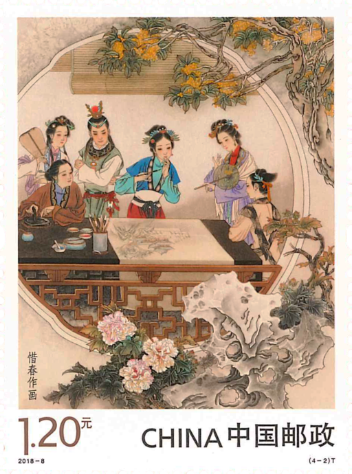小型张“雅结海棠社”见第37回。在探春的倡议下,大观园诸人在秋爽斋偶结海棠社。探春之诗气韵高洁,宝钗之诗含蓄浑厚,黛玉之诗风流别致,皆寄寓着个人的身世之感,同时也预示着将来的命运。