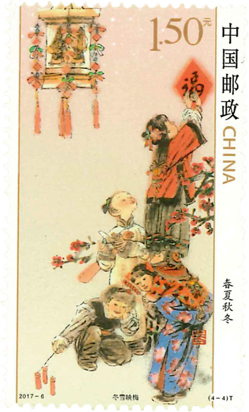 地球在围绕太阳不停地公转的同时,也在绕自身的地轴自转,不过地轴并不垂直于公转轨道面,而是有一个66.5度的倾角。正因为这个倾角的存在,才会使太阳在地球表面的直射点在南、北回归线之间移动,从而形成了春夏秋冬,又称为“四季”。春天始于二十四节气中的“立春”,夏天始于“立夏”,秋天始于“立秋”,冬天则始于“立冬”。四季的概念在黄河流域最为确切,我国劳动人民总结的基本规律是春生、夏长、秋收、冬藏。正是《黄帝内经》等国学典籍所阐述的人与自然关系的基本思想。春夏秋冬四季在中国人眼里不仅是季节的分界,更是人与自然的和谐相处。邮票内容分别为:春燕剪柳、夏荷戏水、秋鸡鸣穗、冬雪映梅。“春”来微风和煦、两岸柳扬,一群幼童在放风筝;“夏”时孩子们摇着小船穿梭在荷花荡,有的顶着荷叶帽,有的摆弄着手中莲花;“秋”日云高万里,遍布金黄色调。孩童们忙着收稻谷;“冬”有飘漫天、梅红绽放,女儿家在忙着贴福字、孩童们蹲在地上放鞭炮,给新年讨个好彩头,一派喜气祥和的景象。