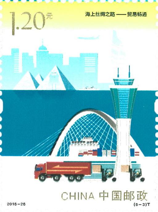 海上丝绸之路是指中国与世界其他地区进行经济文化交流、交往的海上通道。在唐、宋、元的繁盛期,中国境内主要由泉州、广州、宁波三个主港和其他支线港组成,为联合国教科文组织唯一认定的海上丝绸之路起点。丝绸之路不是具体的一条路,而是后世对中国与西亚、中亚、西方所有来往通道的统称。在唐中期前,对外主通道是陆上丝绸之路,之后由于战乱及经济重心转移等原因,海上丝绸之路取代了陆路成为中外贸易交流主通道,在宋元时期是范围覆盖大半个地球的人类历史活动和东西方文化经济交流的重要载体。2013年9月和10月,中国国家主席习近平在出访中亚和东南亚国家期间,先后提出共建“丝绸之路经济带”和“21世纪海上丝绸之路”的重大倡议。这一构思以“政策沟通、设施联通、贸易畅通、资金融通、民心相通、海上交通”为主要内容,为沿线各国经济社会共同发展创造更加美好的明天。“21世纪海上丝绸之路”建设不仅延续古代海上丝绸之路曾经繁荣的海上合作,还赋予其新的时代内涵,使之成为促进共同发展、实现共同繁荣的合作共赢之路,增进理解信任、加强全方位交流的和平友谊之路。邮票背景将海上丝绸之路沿线的知名历史古迹与现代地标建筑及示意性的城市建筑群相结合,由古至今,反映出海上丝绸之路的地理范围和其绵延不绝的悠久历史与欣欣向荣的时代风貌。