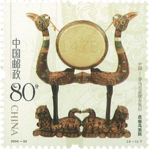 我国与罗马尼亚联合发行《漆器与陶器》邮票一套2枚,我国邮票表现的是荆州出土的文物虎座鸟架鼓。虎座鸟架鼓属战国时期楚国漆木制品,其造型生动,纹饰质朴简洁,彩绘绚丽,是不可多得的艺术佳作。罗马尼亚邮票表现的是“古古丹尼”时期的一件陶器,此件陶器向人们展现了罗马尼亚传统文化的艺术成就。