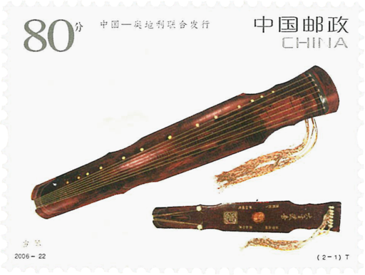 这套邮票由中国邮政和奥地利邮政联合发行,知音琴声远,音乐主题将两个遥远的国度联系到一起。古琴亦称“瑶琴”、“七弦琴”、是中国最古老的弹拨乐器,有三千多年的历变,《诗经》中即有、“窈窕淑女,琴瑟友之”,“我有嘉宾,鼓瑟鼓琴”等名句。它也是中国古代地位最崇高的乐器,被尊为“中国民族乐器之王”。其形如蕉叶,嵌有13个用贝或玉、金制作的琴徽,有七根琴弦。发音深厚深沉,具有鲜明的民族特色和极极其丰富的表现力。抚琴被视为哲学性的艺术或艺术性的哲学,被列于琴棋书画“四艺”之首,是古代文人必修的。在沐浴焚香之后轻拨琴弦,那清冽深沉的声响、诗化的意境、悠远素净的感觉仿佛带入穿越时空,随飘飘仙乐回到远古。历史上著名的琴家有孔子、俞伯牙,蔡邕、蔡文姬、嵇康,李白、杜甫、宋徽宗等。三干多年来,流传下来被称为琴曲之王的《广陵散》、《高山》、《流水》等名曲和伯牙摔琴谢知音等动人传说。2003年,中国古琴艺术被联合国教科文组织列入“人类口头非物质文化遗产代表作名录”。2005年5月,江苏常熟被联合国科教文组织亚太分会授予“古琴之乡”称号。