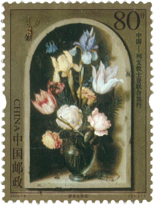 这套邮票由中国与列支敦士登联合发行。其中一枚图案是中国花鸟画一一“玉堂柱石图”,作者是明代著名画家陈洪绶(号老莲);另一枚图案是油画写生静物一一“壁龛花束图”,作者是列支敦士登近现代画家博斯舍尔特。