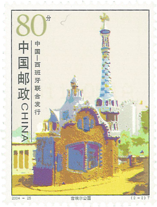 西班牙邮票表现的是巴塞罗那的古埃尔公园。该公园是由西班牙著名现代建筑艺术大师高迪设计,是西班牙建筑史上的经典作品。