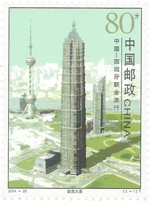 我国与西班牙联合发行《城市建筑》邮票一套2枚,我国邮票表现的是位于上海浦东新区陆家嘴金融贸易中心的金茂大厦。这座88层的高智能现代化摩天大楼已成为上海浦东的新标志。