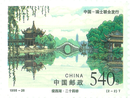 中国的瘦西湖与瑞士的莱芒湖均为世界著名风景区和旅游胜地。瘦西湖,位于江苏扬州,具有中国江南秀美的风光,因其湖身狭长,景色可与杭州西湖媲美,故得此名。此套邮票为中瑞两国联合发行。