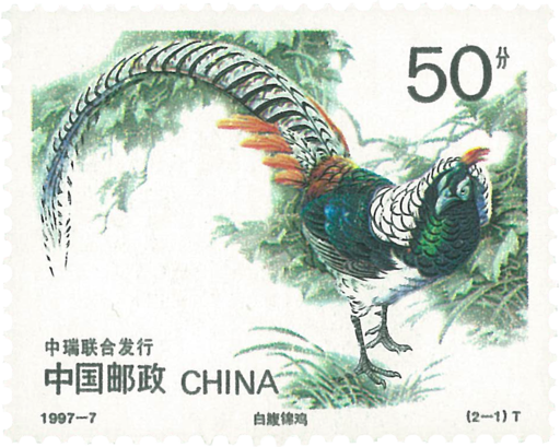 为庆祝我国与瑞典建交47周年,两国邮政部门于5月9日联合发行《珍禽》邮票1套。白腹锦鸡仅分布在我国云南、贵州、四川和西藏的东南部,是中国特产动物。它全身披覆着蓝绿色的羽毛,闪烁着耀眼的金属光泽,头顶、腰背部及尾侧还点缀着红、橙和金黄等色,腹面纯白,通体羽毛搭配谐调艳丽,有“淑女雉”的美称。环颈雉俗名野鸡,原产于中国。雄鸡全身羽毛华丽,呈铜褐色,面部无毛,呈绯红色,颈部黑绿色,产于我国北部和东部的环颈雉在其颈部黑绿色下方有一明显的白色环圈。它是瑞典常见的鸟类,也是瑞典人喜爱的动物之一。