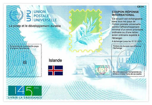 名称:冰岛10月9日发售万国邮政联盟(UPU)成立145周年国际兑换券