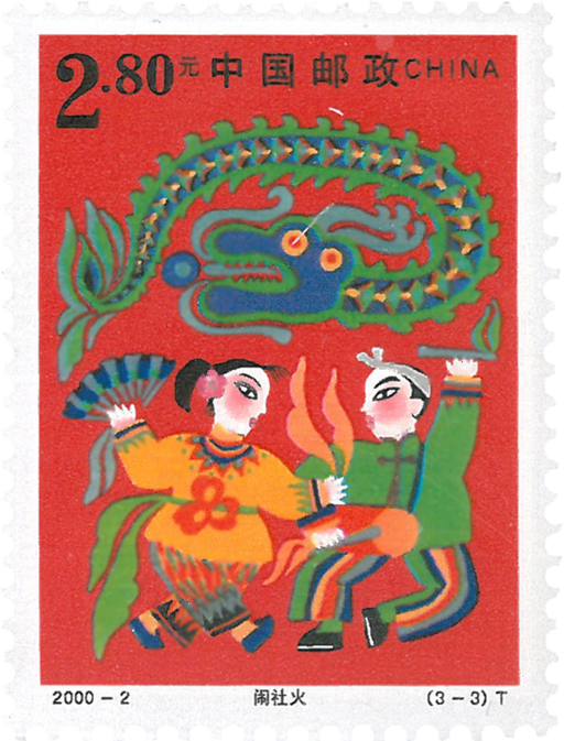 《春节》邮票不仅是中华民族传统节日系列邮票的首枚,也是对新世纪新千年的良好祝愿。《春节》邮票借鉴了民间年画、剪纸戏等多种艺术形式,勾画出贴窗花、放鞭炮、点花灯、舞龙、打手鼓、合家团圆等我国传统的春节喜庆场面。寄托了人们辞旧迎新和对来年幸福的祈盼。《春节》邮票人物造型稚拙可爱、个性鲜明,色彩运用大胆而夸张,黄、绿、红等颜色的强烈对比烘托出节日的喜庆与欢乐。传统艺术与现代高科技的结合,使《春节》邮票焕发出夺人的光彩,并表达了吉祥如意、年年有余、富贵平安的含意。