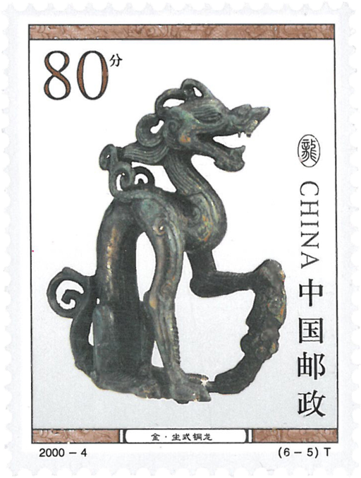 2000年,欣逢千禧,又喜遇龙年。为了庆祝这万载难得的盛事,国家邮政局发行此套文物龙的邮票,给千禧龙年增添了新的喜庆。中国是龙的国度,远在七八千年前,龙的形象就已经在古老的中华大地上孕育、萌生了。新石器时代·玉龙—内蒙古翁牛特旗出土。高26厘米,是目前我国发现最早的带想象意味的龙,有“天下第一龙”之称。现藏中国历史博物馆。战国·龙形玉饰—湖北随州曾侯乙墓出土的玉饰中选择的。腾空欲飞的造型,十分生动。现藏湖北省博物馆。汉·青龙瓦当—陕西西安汉城遗址出土。瓦当上的青龙躯体强健,形象极为勇武。现藏陕西省博物馆。唐·盘龙纹铜镜—系传世品。直径19.5厘米,背饰盘龙奔腾屈曲,周围祥云缭绕,使人感到雄奇莫测。现藏中国历史博物馆。金·坐式铜龙—黑龙江阿城上京会宁府遗址出土。这尊坐式铜龙,高19.6厘米,造型生动,别有意境。现藏黑龙江博物馆。清·紫檀宝座嵌镙钿云龙—系传世品,皇帝的象征,故为五爪。图案用螺钿、玳瑁、染牙、寿山石镶嵌而成,豪华繁缛,是宫廷龙纹造型的典型代表。现藏故宫博物馆。