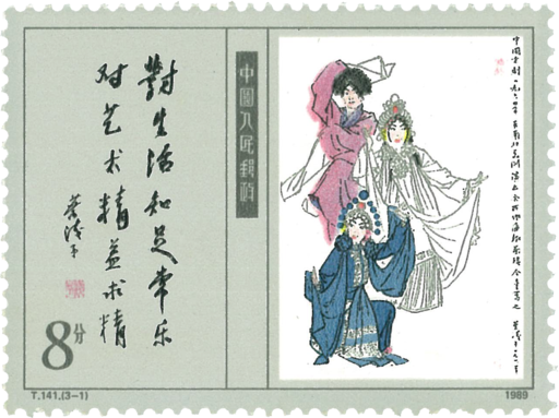 当代美术作品选第一组的邮票画面分别选自当代美术大师叶浅予的《白蛇传》、李可染的《细雨漓江》、吴作人的《齐奋进》,采用中国古典册页的装帧设计形式,右面为绘画作品,左面配以画家的题词,令观者在欣赏美术大师绘画作品的同时,也能品味到他们高超的书法艺术。
