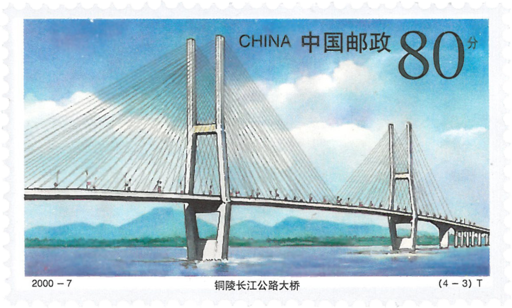 这是反映社会主义建设成就中桥梁建设的邮票,以钢笔淡彩表现了4座长江公路大桥的不同特点。在世纪交替千年更始之际发行,寓意为通向新世纪的幸福桥梁。万县长江公路大桥—该桥1994年5月28日正式开工,1997年6月20日通车。全长856.12米,桥宽24米,全封闭。桥下净空高140米,可通行万吨巨轮。是目前世界上同类型桥中最大的桥。黄石长江公路大桥—该桥1992年7月正式开工,1996年竣工通车。全长2580米,其中主桥1060米,连续总长度在目前同类型桥中居世界第一;单跨245米,为亚洲第一、世界第二。铜陵长江公路大桥—该桥1991年12月15日举行典礼,1992年5月2日正式开钻,1995年12月26日建成通车。全桥总长2592米,其中主桥八墩七孔,长1152米。在目前已建成的同类型桥梁中居亚洲第一、世界第三。江阴长江公路大桥一这是一座体现90年代一流水平的大桥,于1999年建成通车。全长3071米,其中主跨1385米,为世界第四大跨经悬索桥梁。