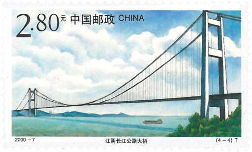 这是反映社会主义建设成就中桥梁建设的邮票,以钢笔淡彩表现了4座长江公路大桥的不同特点。在世纪交替千年更始之际发行,寓意为通向新世纪的幸福桥梁。万县长江公路大桥—该桥1994年5月28日正式开工,1997年6月20日通车。全长856.12米,桥宽24米,全封闭。桥下净空高140米,可通行万吨巨轮。是目前世界上同类型桥中最大的桥。黄石长江公路大桥—该桥1992年7月正式开工,1996年竣工通车。全长2580米,其中主桥1060米,连续总长度在目前同类型桥中居世界第一;单跨245米,为亚洲第一、世界第二。铜陵长江公路大桥—该桥1991年12月15日举行典礼,1992年5月2日正式开钻,1995年12月26日建成通车。全桥总长2592米,其中主桥八墩七孔,长1152米。在目前已建成的同类型桥梁中居亚洲第一、世界第三。江阴长江公路大桥一这是一座体现90年代一流水平的大桥,于1999年建成通车。全长3071米,其中主跨1385米,为世界第四大跨经悬索桥梁。