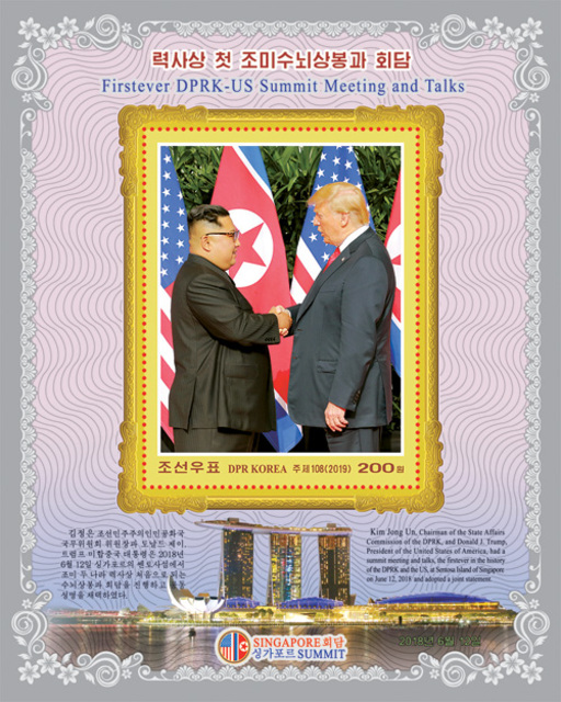 名称:朝鲜6月12日发行最高领导人金正恩会见美国总统唐纳德·J·特朗普小型张