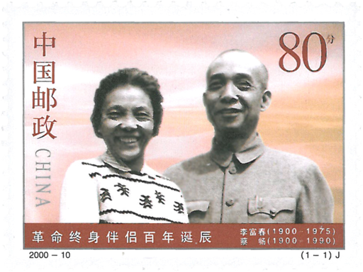 无产阶级革命家李富春和中国妇女运动的杰出领导人蔡畅同为湖南人,均诞生于1900年5月。李富春1900年5月22日诞生于湖南长沙市,1919年赴法国勤工俭学,1922年加入中国共产党。建国后曾任国务院副总理,国家计委主任,中共第八届政治局委员、常委,第七至十届中央委员。1975年1月9日病逝于北京。蔡畅1900年5月14日诞生于湖南双峰县,1919年赴法国勤工俭学,1923年加入中国共产党,同年与李富春结婚。建国后曾任全国妇联主席、名誉主席。第四、五届全国人大副委员长,中共第七至十一届中央委员。1990年9月11日病逝于北京。这枚邮票既是对这对革命伴侣百年诞辰的纪念,也表现了他们忠贞的爱情。