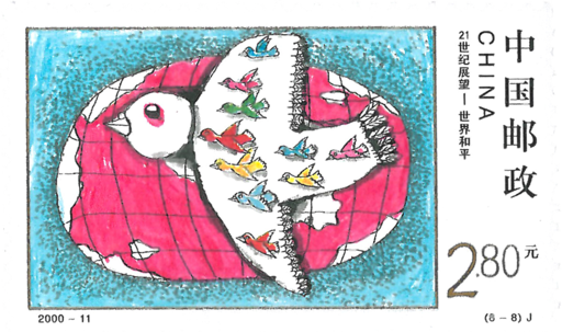 这是中国邮政发行的《世纪交替千年更始》系列的第二套邮票。“21世纪展望”是8幅儿童画作品,以儿童的视角去看未来世界,想象新世纪科技的发明创造和人类的衣食住行,并表达了我国儿童对新世纪的美好祝愿。这8幅邮票图案是从全国范围内开展的“展望新世纪邮票”儿童设计竞赛活动中的200幅儿童画中评选出来的。图画中透出的:儿童稚拙的笔触、奇特的构思、大胆的设色,无不体现了中国邮票设计艺术后继有人的光明前景。世界上有30多个国家和地区开展了这种活动。