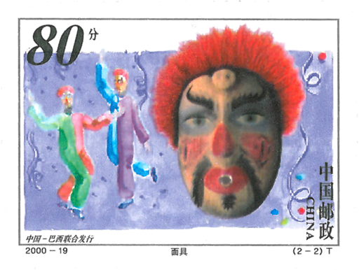我国的木偶起源于西周。现代木偶的种类流派,基本上是明清以来所形成的格局的延伸与发展,主要有提线、杖头、布袋、铁枝、舞傀儡等。提线木偶古称“悬丝傀儡”、“刻木牵丝”,其表演难度大,流行于福建泉州、广东五化、湖南平江等地。其存量少,质量精,急需珍惜与发展。南美洲的民族面具因受欧洲文化的影响,衍生出许多新品种,除恶魔面具、神灵面具、死亡面具之外,又有寓意剧面具、狂欢节面具、万灵节面具、丑角面具、器乐面具、装饰面具等。本套邮票分别取材于中国的提线木偶和巴西的狂欢节面具。