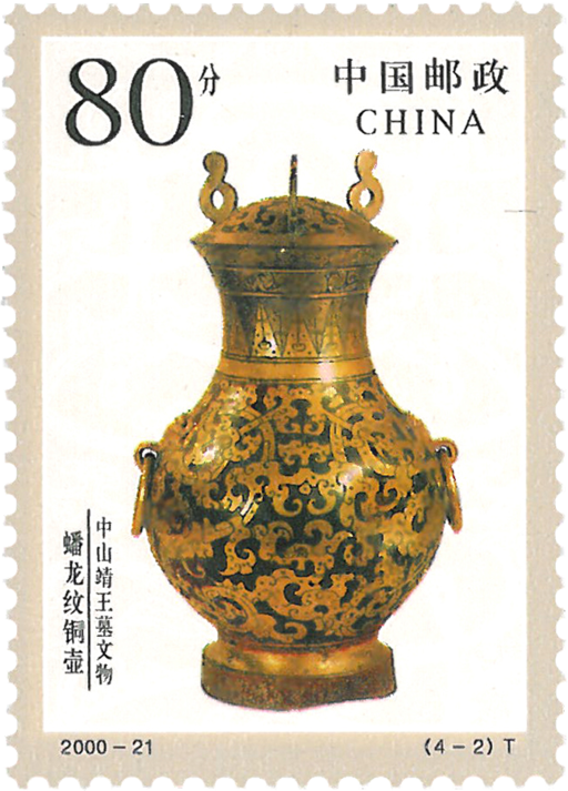 中山靖王墓是西汉中山靖王刘胜及其妻窦绾之墓。在河北满城县城西南约1.5公里处陵山主峰东坡,凿山为陵坐西朝东,墓室庞大,随葬品豪华奢侈。两墓出土金、银、铜、铁、玉、石、陶、漆等物品,丝织品、银鸟篆壶和医用金针共一万多件。其中有:长信宫灯,高48厘米,铜质鎏金,作宫女跪坐执灯状,可调节灯光的照度和照射的方向,灯盘、屏板、灯罩及“侍女”的头部都能拆卸,以便清洗。据宫灯铭文得知此灯于汉文帝前八年铸造。错金博山炉,是一种熏炉,高26厘米,通体金丝错出精致的纹饰。工艺之精湛,举世罕见。刘胜一生嗜酒如命,墓中各色青铜酒器目不暇接。蟠龙纹铜壶是其中一件,高59.5厘米,壶身有鎏金龙纹。朱雀衔环杯的造型别开生面,雀嘴衔环翩翩起舞状。本套邮票中的“长信宫灯”曾见于1973年11月20日发行的编号(73)邮票,这次是再现方寸。
