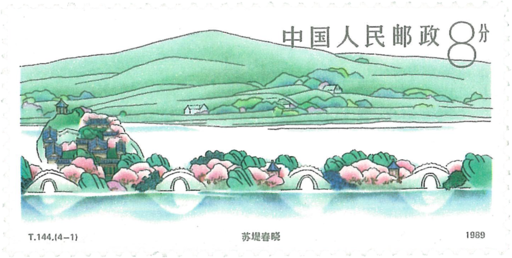 西湖位于浙江省杭州市西,三面环山,一面临城,景区面积达49平方公里,风景名胜40余处,重点文物古迹30余处。沿湖四周花木繁茂姹紫嫣红;群山中穿插着泉、池、溪涧,点缀着亭榭、楼阁、宝塔、石窟。湖光山色美丽如画。春夏秋冬,昼夜阴晴,皆各有逸趣,美不胜收。本套邮票表现了西湖春夏秋冬四季的不同风光。苏堤春晓一苏堤,是一条纵贯西湖南北的林荫大堤,全长2.8公里。长堤上有映波、锁澜、望山、压堤、东浦、跨虹六座石拱桥,座座是眺望景观的佳地。每当春季,漫步堤上,看西湖从晓雾中苏醒,翠柳轻扬,春风骀荡,好鸟和鸣,令人心旷神怡,故称“苏堤春晓”。曲院风荷一在苏堤跨虹桥西北。是西湖历史上赏荷最佳处。现建成以夏景为主题的大型公园,有五个荷花池,分别栽植了红莲、粉莲、白莲。白昼,映日的荷花分外艳丽;夜晚,清风送来冉冉荷香。三潭印月一三潭印月石塔为明天启元年(1621年)补立。塔高出湖面2米,塔身中空球形,环绕着五个圆孔。每年夏秋夜晚,塔里点燃灯烛,烛光从中透出,宛如十五个小月亮,倒影湖面。断桥残雪一断桥处于里西湖和外西湖的分水点上,这座单孔拱桥最妩媚时,是瑞雪乍睛之时,分不清哪是桥,哪是堤。如巧遇桥的阴面积雪未融,桥的阳面雪已化尽,这时,乍一看,就像桥与堤隔断,“断桥残雪”的意境就呈现眼前。小型张上的西湖全景采用写意水墨画法,渲染出它那梦幻般的“水波潋滟”、“山色空濛”的恬幽意境。