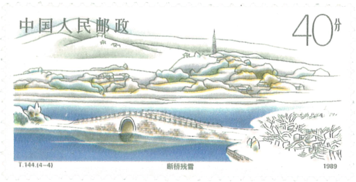 西湖位于浙江省杭州市西,三面环山,一面临城,景区面积达49平方公里,风景名胜40余处,重点文物古迹30余处。沿湖四周花木繁茂姹紫嫣红;群山中穿插着泉、池、溪涧,点缀着亭榭、楼阁、宝塔、石窟。湖光山色美丽如画。春夏秋冬,昼夜阴晴,皆各有逸趣,美不胜收。本套邮票表现了西湖春夏秋冬四季的不同风光。苏堤春晓一苏堤,是一条纵贯西湖南北的林荫大堤,全长2.8公里。长堤上有映波、锁澜、望山、压堤、东浦、跨虹六座石拱桥,座座是眺望景观的佳地。每当春季,漫步堤上,看西湖从晓雾中苏醒,翠柳轻扬,春风骀荡,好鸟和鸣,令人心旷神怡,故称“苏堤春晓”。曲院风荷一在苏堤跨虹桥西北。是西湖历史上赏荷最佳处。现建成以夏景为主题的大型公园,有五个荷花池,分别栽植了红莲、粉莲、白莲。白昼,映日的荷花分外艳丽;夜晚,清风送来冉冉荷香。三潭印月一三潭印月石塔为明天启元年(1621年)补立。塔高出湖面2米,塔身中空球形,环绕着五个圆孔。每年夏秋夜晚,塔里点燃灯烛,烛光从中透出,宛如十五个小月亮,倒影湖面。断桥残雪一断桥处于里西湖和外西湖的分水点上,这座单孔拱桥最妩媚时,是瑞雪乍睛之时,分不清哪是桥,哪是堤。如巧遇桥的阴面积雪未融,桥的阳面雪已化尽,这时,乍一看,就像桥与堤隔断,“断桥残雪”的意境就呈现眼前。小型张上的西湖全景采用写意水墨画法,渲染出它那梦幻般的“水波潋滟”、“山色空濛”的恬幽意境。
