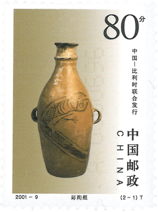 为增进中国与世界各国邮政的交往和文化交流,2001年6月12日国家邮政局与比利时联合发行《陶瓷》邮票一套2枚,邮票图案由中国的“陶器”和比利时的“瓷器”两图组成。中国选取了1958年甘肃出土的,距今5000多年前的属新石器时代庙底沟类型的彩陶瓶,比利时选取了现藏于布鲁塞尔皇家艺术博物馆的中国清代景德镇定烧瓷粉彩壶。