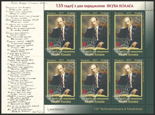 名称:白俄罗斯11月15日发行雅各布科拉斯诞辰135周年邮票